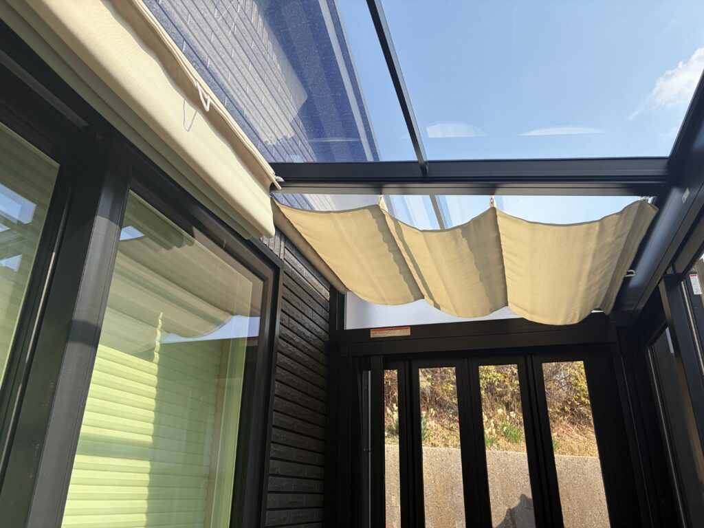 サンルームは、熱くなりやすいので、天井用のカーテンをつけています。